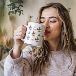 TAZA BLANCA CON CARITAS CON GORRO DE ELFO PERSONALIZADA.